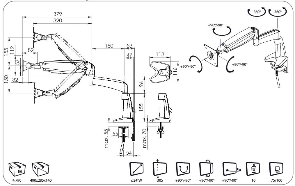 With a total reach of 560mm, the Dataflex 57.153 Monitor Arm is suited to most workplace environments.